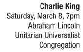 BAND SPOTLIGHT | Charlie King After 50 years of performing and 40 years of songwriting, the quite well known and extremely well traveled, Charlie King celebrates by releasing another record and making a Midwest March tour. The retrospective album So Far, So Good contains 40 songs to mark the 40 years of musical storytelling and political satirizing that is King’s trademark. Charlie’s had original songs recorded by folk luminaries such as Pete Seeger, Holly Near, Ronnie Gilbert, John McCutcheon, Arlo Guthrie, Peggy Seeger, Chad Mitchell and Judy Small. He’s also garnered several national and international song awards in the justice, peacemaking and labor camps, proving that writing important songs about social events can and does make a difference in bettering our world. Or in Charlie’s words, “What I most value in a song is the way it helps us see an old reality in a totally new light.” On Sunday morning he presents a sincere, heartfelt and first person tribute to the late, great Pete Seeger during the ALUUC morning service at 10:30.
