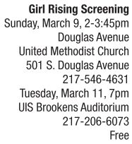 An important documentary, Girl Rising, will be shown twice in Springfield, at Douglas Avenue United Methodist Church on March 9, and Brookens Auditorium, University of Illinois Springfield, on March 11. The film was conceived by a team researching how to end global poverty that found that educating girls offers the highest return on investment in breaking the cycles of poverty. Girl Rising follows nine girls and their struggles to get a basic education. Narrated by a host of celebrities, it was directed by Academy Award-nominee Richard E. Robbins. Admission is free, but donations are welcome to help support the empowerment of girls and women. Sponsors are Friends of Brookens Library and the local chapters of Dining for Women, a national organization that funds efforts to help women and girls in developing countries. Visit girlrising.org for more info.