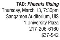MUSIC | Japanese drumming This isn’t just drumming – this is an amazing combination of percussion instruments that look like beautiful sculptures, explosive and hypnotizing sounds of Taiko drumming and the perfectly in sync, choreographed movements of drummers with costumes and bodies that resemble fine art. You will marvel at the athletic energy, stamina and skill these Japanese musicians display. To reach this level of precision, the TAO stars live and train for many years at a compound in the mountains of Japan. Among the performers is a hard rock musician, a gymnast and a composer, each bringing something unique to the presentation. See also