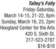 THEATER | Laughter and love Locals Johnny Molson and Mary Young star in the Lanford Wilson Pulitzer Prize-winning play Talley’s Folly at the Hoogland Center for the Arts, March 14-16 and 21-23. Set in Missouri during 1944, Matt Friedman is a Jewish accountant from St. Louis who has returned to a rural boathouse where he met Sally Talley to profuse his love for her with hopes to win her heart forever. Presented by the Hoogland and Playhouse on the Square, the play is directed by Rich McCoy.