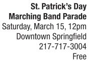 HOLDIAY | Curbside celebration Springfield’s 30th Annual St. Patrick’s Day parade will “Rock the Blarney” through the streets of downtown Saturday at noon. Floats, bands and at host of local folks and organizations will once again wow and please the crowd. Look for numerous radio station personalities, Springfield Police and Fire Departments, Springfield Junior Blues hockey team, Springfield BMX club, Sangamon Valley Model A Ford Club, Saint Andrews Society of Central Illinois bagpipers and drummers, MidState Mayhem Roller Derby, Marine Corps League Collier Harrison Detachment, Gold Wing Road Riders Chapter T, Central Illinois Corvettes, Inc., and this year’s Grand Marshal Inter-Veterans Burial Detail. A parade map and lots of info, including a clock ticking down the hours, minutes and seconds until parade kickoff can be found at springfieldirish.org. See also
