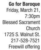 In honor of Bach’s birthday (Bach was born March 31, 1685), four local talented musicians will perform a baroque concert at Blessed Sacrament Church on the evening of Friday, March 21. Oboist Krista Steller is a member of the Sangamon Woodwind Consort and Jacksonville Symphony and teaches private oboe lessons. Jody Kienzler is a mezzo-soprano with a master’s in voice and vocal performance and is music director of Blessed Sacrament Church. Organist Dale Rogers is director of music and arts at Westminster. He holds a master’s degree as a member of the first graduating class of the Yale University Institute of Sacred Music and has performed with the Indianapolis Chamber Orchestra, Illinois Symphony Orchestra and the Columbus Pro Musica. Diane Dietz is a soprano who performs regularly in central Illinois and St. Louis. With a master’s degree in vocal performance and former faculty at several colleges, she now owns a private voice and piano studio in Springfield. Music selections will be from the Stabat Mater of Pergolesi, “Passacaglia and Fugue in C minor” by Bach and Geminiani’s “Oboe Sonata.” A portion of a freewill offering will go to Springfield Food Pantry.