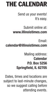Art + Science of Craft Beer Apr 4, 5-8pm Fri. Exhibit on history of drink in Illinois, museum curators and scientists on hand for questions, local brewery, music, food for purchase. 217-782-5949. Illinois State Museum, 502 S. Spring St, 217-782-7386.