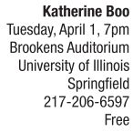 Journalist and author Katherine Boo will discuss her award-winning book, Behind the Beautiful Forevers, during a rescheduled talk and book signing at the University of Illinois Springfield Brookens Auditorium. Behind the Beautiful Forevers tells about the courageous lives of those living in an Annawadi, Mumbai slum in the shadows of luxury hotels near the Mumbai airport. The book won the National Book Award for Nonfiction in 2012, was shortlisted for the Pulitzer Prize, and appeared on a host of “best book” lists for 2012. Boo is a staff writer for The New Yorker and former reporter and editor for The Washington Post. Over the years, her reporting from disadvantaged communities has been awarded a Pulitzer Prize, a MacArthur “Genius” grant and a National Magazine Award for Feature Writing.