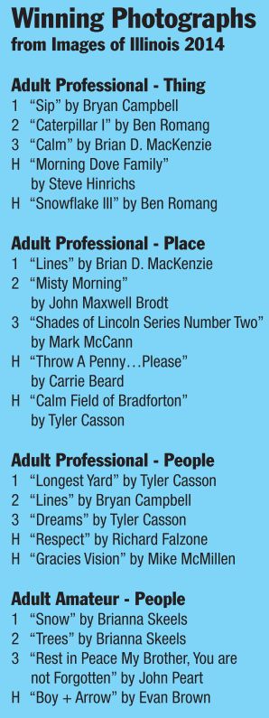 MacKenzie’s photo took first place in the Adult Professional – Place category, followed by second-place winner “Misty Morning” by John Maxwell Brodt of Springfield; third place “Shades of Lincoln Series Number Two” by Mark McCann of Dawson and honorable mentions for “Throw a Penny … Please” by Carrie Beard of Springfield and “Calm Field of Bradforton” by Tyler Casson of Springfield.