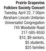 MUSIC | American notes Longtime rural Midwestern singer/songwriter Chris Vallillo headlines the Prairie Grapevine Folklore Society Concert on Tuesday evening, April 22. Known for his skillful guitar playing and singing, Vallillo’s 2008 Abraham Lincoln in Song, released by Gin Ridge Records, reached No. 10 on Billboard’s bluegrass album chart. Dirty Linen magazine described his music as “vivid, original story songs” delivered with an “eye for detail and a sense of history” while Folk Wax magazine said “Vallillo’s guitar playing flows like warm honey and is a true aural delight.” Grammy-nominee Rocky Maffit joins Vallillo. See also