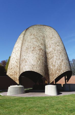A 1960s structure is the ecumenical Roofless Church, a 50-foot shingled dome open to the sky to symbolize all worshipping humanity. It sits in the middle of a courtyard with gardens and sculptures and houses a bronze “Descent of the Holy Spirit” statue by Jacques Lipchitz.