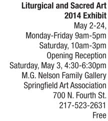 ART | Spiritual perspectives Springfield Art Association’s part in the Liturgical Arts Festival of Springfield kicks off Saturday, May 3, 4:30-6:30 p.m., with an opening reception of its month-long exhibit titled, Come Creative Spirit. Thirty-five artists from 12 states had works chosen by a jury of artists to participate in the exhibit that explores spirituality and faith from diverse perspectives. Eight locals have work in the display. From Springfield Wendy Allen – “Holy Ma Durga,”; “Ganesh” (pictured, left), “Quan Yin Altar”; Delinda Chapman, “If they had guns …”; Paul Jurgens, “Mary, Christ and St. John the Baptist”; Betsy Dollar, A Lesson in Letting Go; Dennis Morris, “Genesis Separation of Waters”; Felicia Olin, “Blood Tears”; Marianne Stremsterfer, “He Has Come to Save Us”; and from Edinburg, Amanda Greive, “The Last Judgment” and “Veronica Wipes the Face of Jesus.” An awards ceremony will be held at 5:30. The exhibition will run through May 24. For more information, visit springfieldart.org. Pictured right is “Tree of Life of Eyes” by Tatiana Nikolva-Houston from Austin, Texas. See also