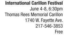 MUSIC | First-class bells The International Carillon Festival returns to Washington Park June 4-8. Touted as one of the world’s most important and prestigious carillon events, this year’s carillonneurs are Robin Austin (USA), Geert D’hollander (Belgium), Frans Haagan (The Netherlands), Claire Halpert (USA), Caleb Malamed (USA), Eddy Marien (Belgium), James Rogers (USA) and students Annie Gregurich and Patrick Knox. A large video screen at the base of the carillon will allow attendees to view the carillon keyboard. The fest kicks off with a special Lincoln program, featuring soprano Gailyn Draper and tenor Jerry Hicks, and narrated by Christian McWhirter. Fireworks are Friday, June 6 at 9:15 p.m. and Saturday, June 7 there will be a Cast in Bronze concert, music on a traveling carillon. Bring a picnic dinner and your lawn chair. A detailed, full program is available at the carillon’s newly remodeled website at carillon-rees.org. See also
