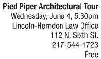 ARCHITECTURE | Inside look This downtown architectural walking tour begins in front of the Lincoln Herndon Law Office on south Old State Capitol Plaza at Sixth and Adams streets at 5:30 p.m. Join Anthony Rubano (pictured here on a previous tour), of the Illinois Historic Preservation Agency, who will discuss the architectural styles, materials and treatments on Adams St. west to the State House Inn. A reception at the State House Inn takes place after the tour. For more information, phone Downtown Springfield, Inc. at 544-1723. See also