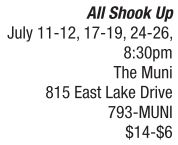 THEATER | Elvis-like energy The Muni’s 2014 season got off to a great start with The Sound of Music and now presents its second show, the musical comedy All Shook Up, opening Friday, July 11. Directed by Anna Bussing, All Shook Up features the music of Elvis Presley including his songs “Jailhouse Rock,” “Love Me Tender,” “Don’t Be Cruel,” and “Can’t Help Falling in Love.” Set in the ’50s, this is the story of a mysterious man who rides into a small town and helps its backward citizens discover the power and magic of rock ’n’ roll and romance. For video clips and a list of the full cast, visit The Muni’s website at www.TheMuni.org. See also