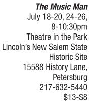 Theatre in the Park at Lincoln’s New Salem State Historic site opens with the Tony-award winning musical, The Music Man, directed by Bill Bauser Jr. “With a cast of 50, there’s plenty of action to see, and you’ll get to hear many song favorites like ‘76 Trombones,’ ‘Lida Rose,’ ‘Wells Fargo Wagon,’ ‘Till There Was You’ and many more.” Set in the early 1900s, Harold Hill is a con man posing as a salesman of band instruments to a small, naive town in Iowa. He plans to get paid then skip town, but falls for the town piano teacher. A free pre-show at 7 p.m. before each performance includes a musical performance by a local group and a talk with the director (on all but July 25).
