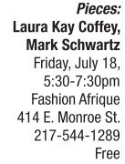 Fashion Afrique opens its doors for an art exhibit. Pieces features the edgy photography and art of well-regarded Springfield-area art photographer Laura Kay Coffey and multimedia artist Mark Schwartz. Approximately 24 pieces of art will be on display and for sale opening night July 18 and through Aug. 1. Music will be by Frank Trompeter Quartet, including Tombé Kemayo, Julie Hulvey and Gordon Carvahlo. Fashion Afrique will serve ethnic foods and present models wearing some of Fashion Afrique’s latest clothing designs in an informal fashion show. Coffey (untitled art, left) has shown at Prairie House Gallery, Vachel Lindsay State Historic Site and currently has a show at Sangamo Club. Schwartz’s collage work was featured by the Illinois Symphony Orchestra and commissioned for American Cancer Society and Pecha Kucha. (Pictured right is “Fish Head in Tux Redux” by Swartz and Coffey.) Schwartz is also a talented experimental guitarist who plays with End Times Trio, scheduled to play Fashion Afrique on July 19 at 7 p.m.
