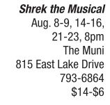 Springfield Municipal Opera’s third show is Shrek the Musical directed by Craig Williams II. Eight shows at The Muni will each come alive with large-scale special effects, say show organizers. Explains Williams, “From his swampy home, Shrek, with his extensive prosthetic makeup, will emerge to fight a 30-foot-long dragon that breathes smoke, flies around the stage and falls in love with a donkey, whose ears actually move. And don’t forget about Pinocchio, whose nose will grow right in front of the audience.” The stage production is based on the Oscarwinning film with everyone’s favorite ogre and spunky donkey. Aug. 14 and 21 are family and senior nights with reduced admission. Tickets are available at The Muni’s website, by phone or on-site 90 minutes prior to the show.