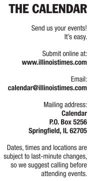 Illinois State Fair Aug 7-17, 7am-12am. So much to do we can’t list everything. Food, entertainment, exhibits and more. 782- 6661. agr.state.il.us/isf Illinois State Fairgrounds, 801 Sangamon Ave, 217- 782-1698.