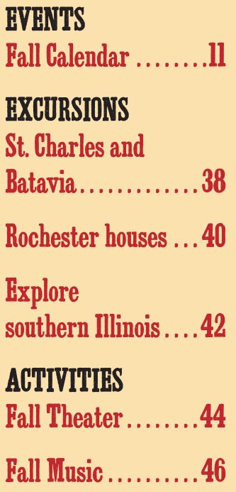 Prairieland Chautauqua Aug 29-Sep 1, 4-9pm Fri-Mon, Musical shows, storytellers, communal suppers, re-enactors representing famous Americans. Free. First Christian Church, 2106 S. Main, Jacksonville. jacksonvilleil.org