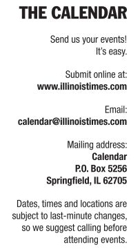 Art Exhibit: Filler Aug 28, Sep 1-4, 8-10, 11am-6pm Mon-Thu, Installation project from Springfi eld native Jeff Robinson, Visual Arts Gallery director UIS instructor. Reception Sept. 4, 5:30-8. UIS Visual Arts Gallery, HSB 201, One University Plaza, 217-206-6506. Artists Night Art Show: The Never-Ending Circle Aug 29, 6-10pm.Art exhibit, cultural etntertainment, spoken word. Free. Floyd’s Thirst Parlor, 210 S. Fifth St. 217-503-8428.