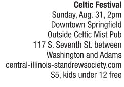 FESTIVAL | Beer and vittles and pipes Rain or shine, Sunday, Aug. 31, enjoy a festival put on by a group that likes to have a good time. Central Illinois St. Andrew Society and the folks of Celtic Mist invite you to their second annual Celtic Festival on the streets of downtown Springfield in front of the Celtic Mist Pub. The St. Andrew’s Celtic Dancers will dance Irish and Scots numbers and St. Andrew’s Pipes and Drums will play a few tunes. There will be a children’s area and lots of food, a variety of drink and Celtic music including The Emerald Underground, Exorna, Dave Littrell, Forrest Harris, Victor McMullan, Celtic Cross Pipe Band, Skibbereen and more. See also