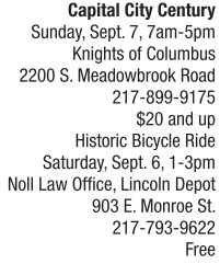 BICYCLING | Wheels in motion This year’s Capital City Century is headed for new territory – historic Clayville, just east of Pleasant Plains. Riders can do loops from the Clayville food stop to add mileage before returning to the Knights of Columbus on Meadowbrook Road. In addition to 40, 56 and 100-mile route options, riders will have a first-ever 125-mile double metric option through Lincoln’s New Salem. A 10-mile family ride led by Jim “Magic” Percy and a 25-mile ride will also be offered. This annual recreational bicycle ride features well marked roads, SAG (support and gear) support, rest stop and a post-pedalin’ party with food and music by the Samba Llamas. The Historic Bicycle Ride, the day prior, starts and ends at a new venue, the Noll Law Center at the Lincoln Depot. Visit www.spfldcycling.org for details and registration options. Pictured from left to right are Harv Koplo, Chanell Bradbury Hamilton, Piper Bradbury, Krin Bradbury-Peoples and Tom Clark. See also