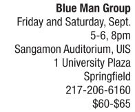 Blue Man Group is a wildly popular stage act consisting of three guys who paint themselves blue and perform a theatrical show that combines comedy, music and multimedia. If you’ve never seen Blue Man Group, they take the stage in Springfield, Sept. 5-6, at Sangamon Auditorium UIS. The New York Times touted the group’s concert as being “one of the most delightful performance pieces ever staged.” For a trio of bald guys who look like space aliens and do not speak, that is quite the statement. And it’s true.