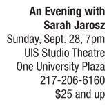 MUSIC | Strong roots Every once and a while a musician seemingly pops into the public’s view and immediately captures their hearts. Sarah Jarosz is that sort of musician. Looking younger than her 22 years, playing the mandolin as if she’s been doing it even longer, Jarosz is like everyone’s daughter or sister, sweet, but with a drove of talent to boot. Playing, singing and writing music as well as she does, as she has on her third album, Build Me Up From Bones, gets one’s name in Rolling Stone Magazine. It also gets one nominated for an Americana Music Association Award for New/Emerging Artist of the Year in 2010, Instrumentalist of the Year in 2011, oh, and Song of the Year in 2012, and nominated for two Grammys for Best Folk Album and Best American Roots Song. Hear her mix of folk, Americana and roots sounds at University of Illinois Springfield Studio Theatre on Sunday, Sept. 29. You know if Alison Krauss and Amos Lee will sit down and play with her, you should sit down with her and take a listen, too.