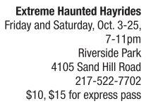 Along the river and through the woods, on a haunted hayride pulled by hearse you’ll go! The spookiest ride in town has returned to Riverside Park for its 15th year. The hayrides occur every Friday and Saturday nights through Oct. 25, weather permitting. This is an extremely popular attraction each year, so be sure to dress warmly and bring cash for hot chocolate and other hot concessions as you wait for your ride – or consider purchasing an express pass for $15 to avoid the line entirely. This event is fun for all ages, but parents should keep in mind that this ride is designed to scare and shock.