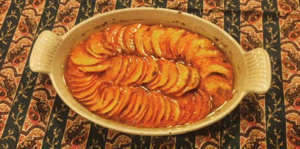 Remove the lid from the casserole. Raise the heat to 425 F. Bake for about another half hour, basting several times until the juices are thick and bubbling and the tops of the sweet potatoes are slightly browned. Let cool slightly before serving.