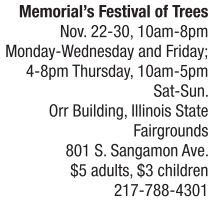 FESTIVALS | Walking in a winter wonderland For the past 24 years, Memorial Medical Center has transformed the Illinois State Fairgrounds Orr Building into a winter wonderland at the annual Festival of Trees event. This year will be no different, as the 2014 festival runs Nov. 22 through 30. The main attraction features more than 150 trees, wreaths and swags decorated by area organizations and businesses. Additional points of interest include a holiday shopping boutique, holiday kitchen, gingerbread cookies, gingerbread village, silent auction and other entertainment. Kiddos will love riding the Candy Cane Express, meeting Santa (who will be on-site daily) and getting crafty during the “Little Elves” workshops. The best part? Funds raised by Festival of Trees support Memorial’s health-related projects and programs at the hospital and in our community. For more information, call 488-4301. See also