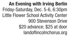 MUSIC | Cabaret Christmas This Friday and Saturday, Dec. 5-6, join the Land of Lincoln Barbershop Chorus at the Little Flower School Activity Center for a fun-filled, cabaret-style holiday show. The vocal styling of this years show is a tribute to the work of 20 th century composer Irving Berlin, one of the greatest songwriters in American history. Berlin’s repertoire spans more than 1,500 songs across a 60-year career and includes such popular songs as “Alexander’s Ragtime Band,” “White Christmas” and more. The music starts at 7 p.m., with a pre-show dinner served at 6:30 p.m. Advance tickets for the dinner and concert can be purchased for $20 by calling 953-0225 in the day time or 871-9731 in the evening. See also