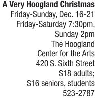 THEATER | Star-studded seasonal showcase For one weekend only, The Hoogland Center for the Arts hosts the sights and sounds of Springfield’s favorite local celebrities and the Hoogland Teens, Kids and Juniors. This annual event showcases classic holiday tunes, contemporary Christmas songs and beautiful, sacred music. Hosted by Julie Staley, this dazzling show will highlight local favorites such as Josh Ratz, Nathan Carls, Abigail Peecher, Debbie Ross, Mary Kate Smith and Matthew Vala, plus The Hoogland Teens, Kids and Juniors, a year-round performance group for talented youth in grades 1-12 who are interested in learning theater basics. Participants train year round in singing, acting and dancing, ultimately participating in 25-30 performances annually. For more information or to purchase tickets for A Very Hoogland Christmas, visit http://hctfa.org or call The Hoogland Center for the Arts at 523-2787. See also