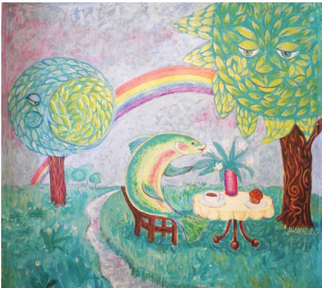 A benign rainbow trout sits comfortably – as best a trout can – before its coffee cup, smelling a lily. Yes, it’s our favorite trout from the mural painted by Julie Hulvey that once graced the wall of the Trout Lily Café, on Sixth Street downtown. For 12 years we enjoyed that trout, and coffee, and cinnamon buns, and pleasant conversation, at this imaginative spot presided over by Kate Hawkes, until the state offices were dispersed (by the governor) far from downtown Springfield, and the numbers of people working downtown were no longer enough to support the café. Kate, and other downtown small businesses, were forced to shutter their doors.