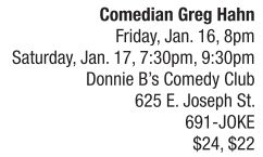 THEATER & COMEDY | Corporate clog turned comedy cash cow The outrageous, fun and ridiculous Greg Hahn draws comedic inspiration from his varied life experiences. Lucky for his audiences, Greg’s life is fascinating. Hailing from South Florida, Greg served as a captain in the Marine Corps and worked as a buyer for Lockheed Corporation before deciding to forgo the corporate world for the entertainment world. After a string of hilarious odd jobs such as emceeing a theme park lumberjack show and working as stunt man at Florida’s Universal Studios, Greg relocated to New York City where he became the touring comedy headliner he is today. Greg is a favorite of the “Bob and Tom Show” and has also appeared on many other popular shows such as “Late Night with Conan O’Brien,” “Louis CK’s Pulp Comics” and “Star Search.” For this weekend only, you’ll have three chances to catch Greg’s one-of-a-kind, uproarious show. Tickets are available for $24 or $22 by calling Donnie B’s Comedy Club at 691-JOKE. See also