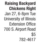 ENVIROMENT | Caring for chickens Backyard chicken coops have steadily been gaining popularity in the U.S. during the past several years. Backyard chickens make innovative pets and function as an extremely local food source, offering the most fresh and delicious eggs direct from your own backyard. Learn everything you need to know about raising backyard chickens during an information session on home-scale poultry production led by Deborah Cavanaugh- Grant, local foods systems and small farms educator with University of Illinois Extension. The two-hour seminar will cover topics such as initial set up of the chicks, things you’ll need to consider before building a coop and chicken run, how to protect your birds against winter, other inclement weather and outdoor predators and how to legally handle and sell chicken eggs in Illinois. This is a great opportunity for those already raising backyard chickens to meet other like-minded enthusiasts. Space is limited, so preregistration is encouraged by calling 782-4617.