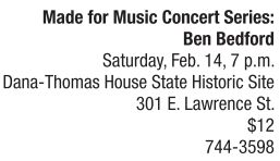 MUSIC | Architecture accentuates music Local talent Ben Bedford, a singer, songwriter and storyteller lauded nationally for writing beautiful songs about historical events, will perform a special Valentine’s Day concert on Saturday, Feb. 14, at 7 p.m., as part of the Made for Music Concert Series at the Dana-Thomas House State Historic Site. The venue, designed by architect Frank Lloyd Wright, provides a beautiful backdrop for the concert and functions as a natural amplifier for sound. Wright created the house specifically with music in mind, building in performance balconies and architectural elements that support and enhance the live music experience. Tickets for Ben’s concert are $12 and should be purchased in advance at http://dana-thomas.org or by calling at 744-3598. See also