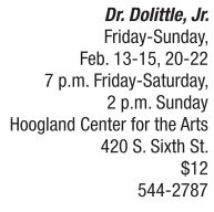 THEATER | A Broadway show for children The newest show for children at the Hoogland Center for the Arts, Dr. Dolittle, Jr., is a musical adaptation of the popular book authored by Hugh Lofting and the film of the same name from Twentieth Century Fox. The musical, about a wacky veterinarian with the ability to communicate with animals in more than 500 animal languages, will be performed six times across two weeks, including two Sunday matinee showings. Tickets are $12 and can be purchased online or via the box office at 544-2787. For more information on Dr. Dolittle, Jr., and other Hoogland Center for the Arts performances, visit http://hcfta.org.
