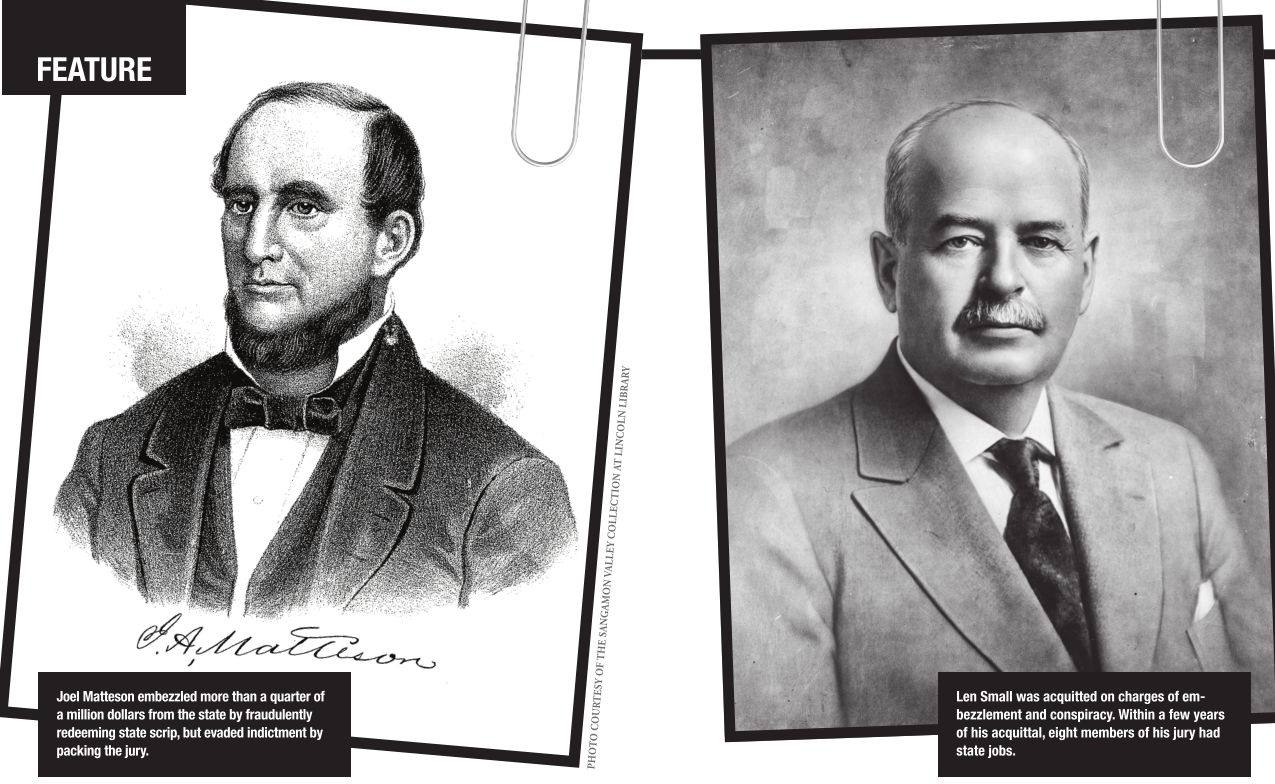 Instead, Gov. Joel Matteson, who held office from 1853 to 1857, ended up embezzling more than a quarter of a million dollars from the State of Illinois by fraudulently cashing in alreadyredeemed state scrip. Despite the overwhelming evidence of his guilt, however, Matteson evaded indictment and was never tried nor sentenced for his misdeeds.