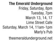 BAND SPOTLIGHT | The Emerald Underground Of all the Celtic-influenced bands now in the Springfield area, The Emerald Underground was the first on the scene way back in 2002. Then called Stone Ring Circle, the group debuted 14 years ago at Marly’s Pub during the St. Pat’s Day Marching Band Parade. This Saturday’s performance continues the tradition at the same club, just as the band continues to evolve with different members. With the departure of longtime wind player Theresa O’Hare and relative newcomer Tom Irwin comes the return of original member Jack White joining with Nat Radwine, Bill McKenzie, Lori McKenzie, Chas Blythe and Megan Turner in forming the latest version of the longest running Celtic-fusion band in town. They are also the busiest band “Irish-ing it” during the “High Holy Days” with three shows at Lime Street Cafe, one at Marly’s, a private party and a top-it-off gig at Robbie’s next Friday, March 20. Expect to enjoy many of those pure TEU classics along with several new tunes set to keep the music fresh and fun. See also
