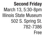 ART | Night at the museum If you enjoyed the Illinois State Museum’s First Friday events in 2014, you will love 2015’s Second Fridays. It’s the same location, same concept, held on the second Friday of the month to honor the second year of this popular event. The first Second Friday will feature live bluegrass music by The Blue G’s, food by Cooper’s StrEATside Bistro food truck, POUR bar, make-and-takes that combine text and technology plus the Pro-Text art exhibition, which opened last week. And, as always, the museum will be open for exploration. Admission is free, with food and drink available for purchase. For more information about Second Fridays and the Illinois State Museum, visit http://museum.state.il.us. See also