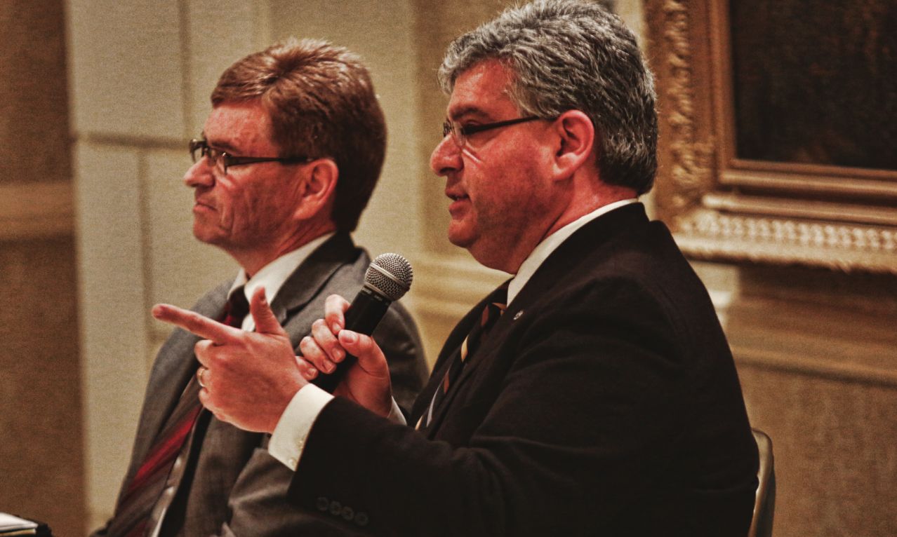 It is near the end of a grueling day on the campaign trail. The two candidates for Springfield mayor are sitting side by side in a Lincoln Library meeting room, where they’ve spent more than 90 minutes fielding questions at a candidate forum sponsored by the Faith Coalition for the Common Good.