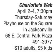 CHILDREN’S CORNER | A classic children’s tale This weekend enjoy a performance of Charlotte’s Web by Jacksonville’s Playhouse on the Square. The play, based on the classic children’s tale by E.B. White, will be performed April 2, 3 and 4, at 7:30 p.m., at the Playhouse on the Square theater, located at 68 E. Central Park Plaza in Jacksonville. A dozen local children will play the parts of Wilbur, Templeton, Lurvy and more. The play is directed by Laurie McCoy. Tickets can be purchased $10 for adults, $5 for children at Our Town Books, Soap Company Coffee House or by calling the Playhouse on the Square at 491-3977. For more information about Charlotte’s Web or Playhouse on the Square, visit http:// playhouseonthesquare.net.