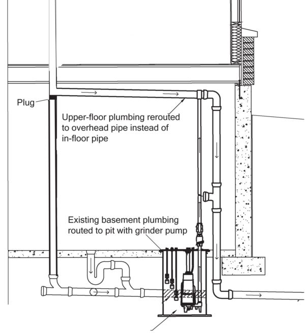 That’s accomplished by routing all plumbing lines from the first floor and above into a tall pipe that connects to the sewer. Meanwhile, any plumbing in the basement or cellar is disconnected from the main sewer and rerouted to a catch basin with a grinder pump. The pump grinds up any solid material and pumps it upward to the top of the tall pipe. That means the water level of an overflowing sewer would have to build significantly higher to escape the plumbing.