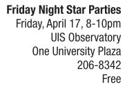 University of Illinois Springfield announces the return of their annual Friday Night Star Parties, which will be held, weather permitting, every Friday night during April from 8 to 10 p.m., at UIS Observatory, located off the southeast corner of Brookens Library. The Star Parties are hosted by Dr. John C. Martin, associate professor of astronomy/physics at UIS. Each party begins with a presentation about the galaxies, the sun and the stars. Once guests are on the observation deck, they are welcome to use observatory telescopes to view planets and the constellation. This is an open-house style event. Participants are free to come and go as they please between 8 and 10 p.m. All Star Parties are free and open to the public. Star parties may be canceled due to cloudy or inclement weather. For weather questions, call 206-8342 at 7 p.m. the evening of the Star Party, or check UIS Observatory on Twitter. For more information about Star Parties, visit http://uis.edu.astronomy/about/starparties.html.
