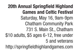 A day of athletic events, drumming, solo piping and highland dancing competition rooted deep in 11th century Celtic tradition awaits attendees of the 20th Annual Springfield Highland Games and Celtic Festival, on Saturday, May 16. Other festival highlights include live music by Exorna, Four Leaf Rovers and The Whiskey Picts, plus vendors, food, children’s activities, animals and more. Admission to the games can be gained at just $10 for ages 13 or up and $5 for ages 6-12. Children under 5 are free. For more information about the 20th Annual Springfield Highland Games and Celtic Festival and a full schedule of attractions and events, visit http:// springfieldhighlandgames.com.