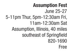 FAIRS & FESTIVALS | Pageants, pet shows, a parade and more Assumption Fest is a three-day, family-fun festival that has been going and growing for more than 80 years, and is proud to offer big-city entertainment in a small-town setting. Two new attractions for 2015 are the look-alike contest ($5 entry fee) and Woody’s Menagerie, a traveling wildlife exhibit. Other festival highlights include live musical entertainment from the Nashvillebased Jessie Brown Band on the main stage on Saturday, Feuding Hillbilly and 90’s Daughter in the beer tents, the 144 th Army Band, a flea market, a carnival with kids’ activities, the Ronald McDonald Magic Show, tractor pulls, a pet show on Thursday night, the Little Miss, Junior Miss and Miss Assumption pageants on Friday night, an hour-long parade leaving from Coal Street on Saturday at 11 a.m., and much more. For more information about Assumption Fest, contact festival president Angela Ohl-Marsters at 820-1690, or find Assumption Fest on Facebook. See also