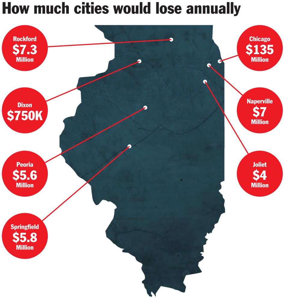 Chicago would see its local share diminish by about $135 million annually, according to the caucus.