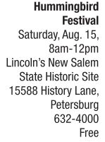 NATURE | A bird-banding bash Enjoy an up-close-and-personal examination of one of the world’s tiniest breeds of birds this weekend at the Sangamon River Audubon Society’s Hummingbird Festival. Hummingbirds, which typically measure no more than 3 to 5 inches in length, derive their name from the humming sound generated by the flapping of their wings, which beat at a speed of approximately 50 beats per minute. Currently, four different species of hummingbirds can be found in Illinois: Ruby-throated, Rufous, Broad-billed and Allen’s. During the festival, Sangamon River Audubon Society members will band and assist with release of the hummingbirds so that the birds’ annual migration patterns may be tracked and studied. Hummingbirds will be available for “adoption” by attendees, and experienced birders will explain how to attract hummingbirds to your garden, as well as how to choose and maintain hummingbird feeders. The Hummingbird Festival is free and open to the public. For more information, visit http://lincolnsnewsalem.com.