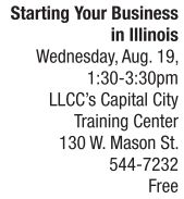 BULLETIN BOARD | Be business-savvy Learn how to bring your business-owning dreams to reality at the Starting Your Business in Illinois seminar on Wednesday, Aug. 19. The complimentary program, hosted by the Illinois Small Business Development Center, is offered monthly at Lincoln Land Community College’s Capital City Training Center. Prospective business owners will learn how to prepare a business plan; gain an understanding of business financing; practice filling out necessary legal forms for proprietorships, partnerships and corporations; learn how to register a DBA, and how to prepare and collect taxes. The Starting Your Business in Illinois program will also be offered on Monday, Aug. 24, at the Jacksonville Chamber of Commerce, from 9-11 a.m. To register for Wednesday’s program, or for more information about other ISBDC services, call 544-7232. See also