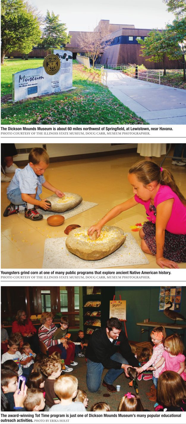 Today, Dickson Mounds Museum is a nationally recognized place to explore and appreciate Native American history. Its 230-acre campus includes a 2,000-year-old mound group called Ogden Site; remains of three 900-year-old buildings called the Eveland village; two one-room schoolhouses; an 1840s, octagonshaped toll station for an early plank road, and a picnic area that is available to the public free of charge.