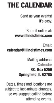 Broadway and Chocolate Aug 28-29, 8pm Fri-Sat. Theatre in the Park fundraiser concert. $8-13. theatreinthepark.net. Theatre in the Park, Lincoln’s New Salem State Historic Site, 15588 History Lane, Petersburg, 632- 5440. Distant Memories Aug 25, 5:30-6:30pm Tue. Every Tuesday, June-Aug, a historical reenactor describes Springfi eld’s reaction to Lincoln’s assassination and his funeral. Free. lincolntomb.org. 217-782-2717. Lincoln’s Tomb State Historic Site, 1500 Monument Ave., 782-2717.