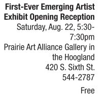ART | New faces in a familiar place The Prairie Art Alliance presents a gallery show resulting from the first-ever group of artists from its Emerging Artists Program. The goal of the program is to further the professional development of new artistic talent and prepare artists to successfully navigate the art world. This is achieved by pairing fresh-to-the-scene artists with veteran PAA exhibitors in one-on-one mentoring relationships. Topics covered include preparing for exhibitions, marketing in the art world, learning to critique their own work and accepting criticism of their work. The program culminates in the Emerging Artist Exhibit which features artworks in a variety of media by Immanuel Ahiable, Julie Alessandrini-Costa, Cathy Ganschinietz, Wiley Jenkins, Laura Mulvey, David Ross and Doug Wagner. The exhibit will be held in conjunction with “Tranquil + Vibrant,” featuring works by current PAA members. Both exhibitions will be on display during gallery hours, Tuesday through Saturday, 12-7 p.m., through Oct. 8. For more information, visit http://prairieart.org. See also